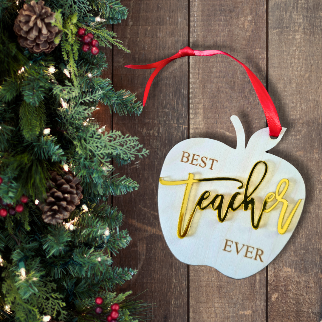 Show your appreciation with a little sparkle! This apple-shaped ornament is laser-engraved on natural birch, with gold mirror acrylic for an elegant, eye-catching touch. A perfect gift to thank that special teacher for all they do—beautiful on a tree, classroom wall, or gift bag.